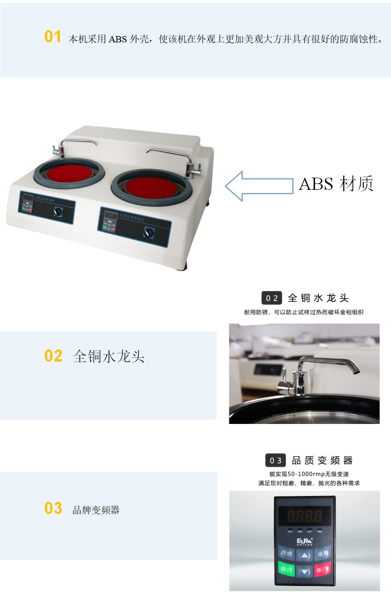 MP-2CE型金相試樣磨拋機(jī)為雙盤(pán)式機(jī),可兩人同時(shí)操作使用,適用于對(duì)金相試樣進(jìn)行預(yù)磨、研磨和拋光操作。