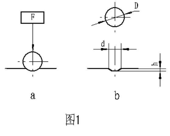 金屬布氏硬度試驗(yàn)系采用一定直徑硬質(zhì)合金球,以規(guī)定試驗(yàn)力壓入被測材料表面(圖1a)按規(guī)定保持時間后,卸除試驗(yàn)力,(圖1b)測量試樣表面的壓痕直徑,以計(jì)算出布氏硬度,并以下式計(jì)算之: