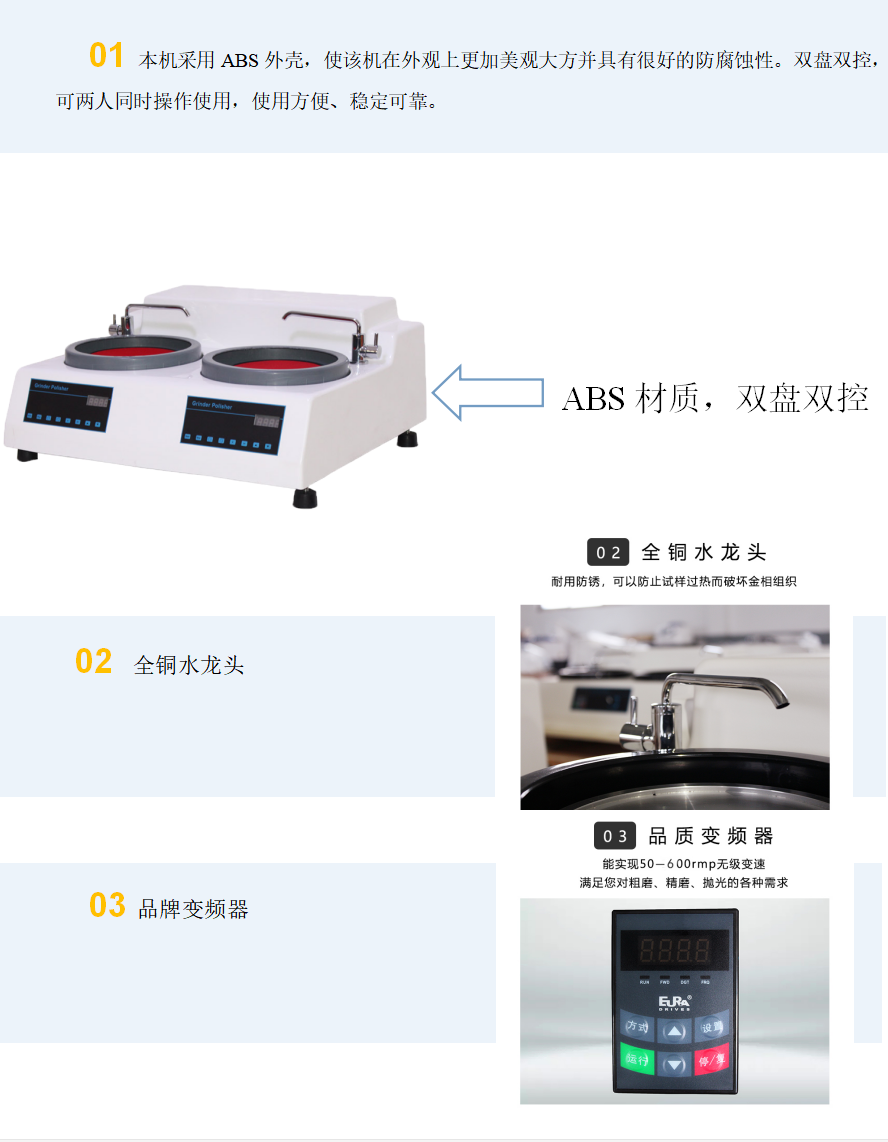 本機(jī)由底座、電機(jī)、磨拋盤及控制面板等組成。本機(jī)采用ABS外殼,使該機(jī)在外觀上更加美觀大方并具有很好的防腐蝕性。